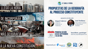 Ayer miércoles 30 de septiembre el Dr. José Orellana participó del 6° Encuentro «Cable a Tierra» titulado «Propuestas de la Geografía al Proceso Constituyente», señalando la premisa: «Llegó la hora de incorporar más geografía a la nueva constitución». El encuentro fue organizado por Alumni UC Geografía, la Sociedad Chilena de Ciencias Geográficas, el Instituto de Geografía UC y el Colegio de Geógrafos de la Región de Valparaíso.